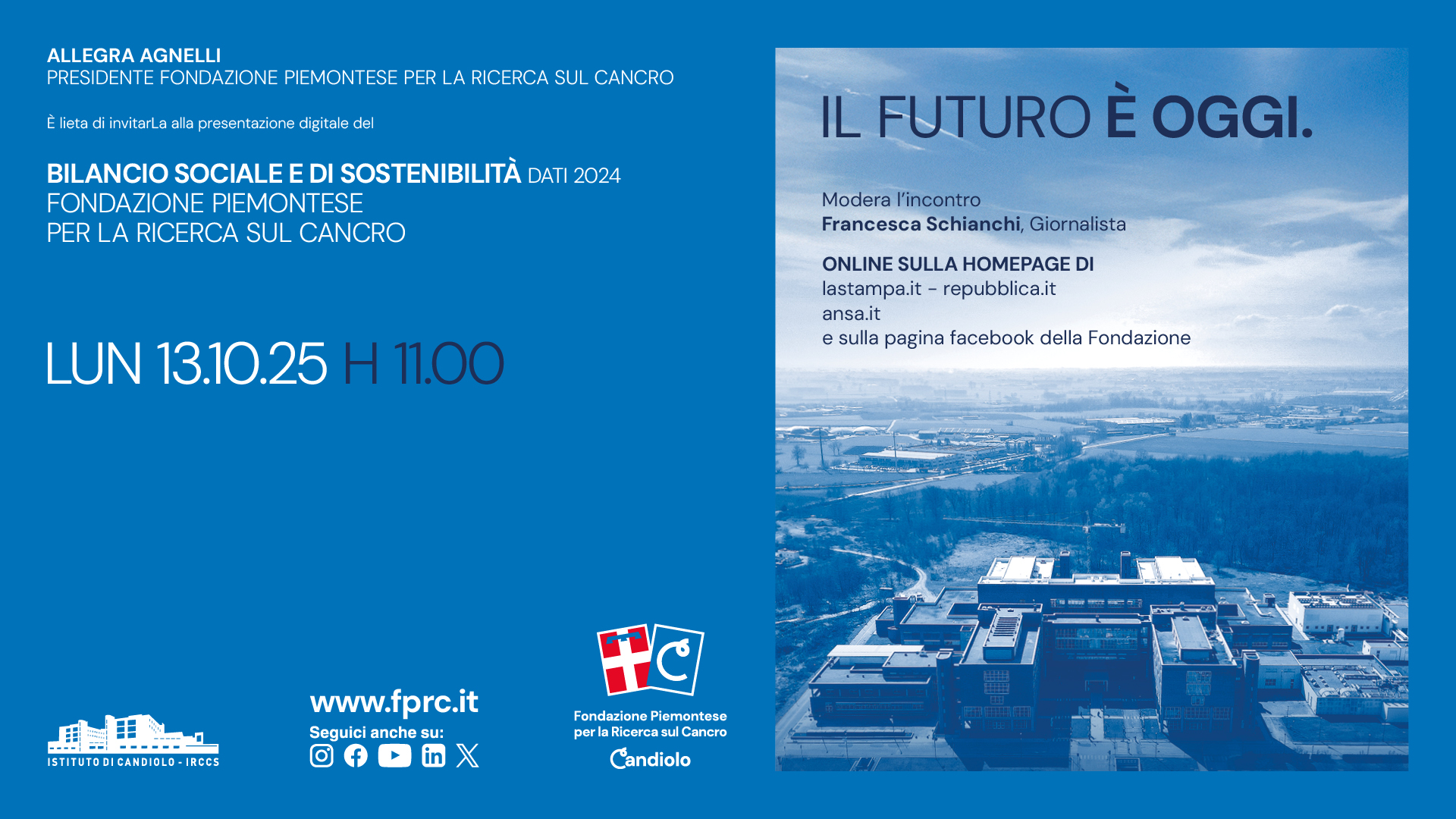 La Fondazione Piemontese per la Ricerca sul Cancro è nata nel 1986 per dare un contributo significativo alla cura e ricerca sul cancro attraverso la realizzazione di un polo oncologico all’avanguardia, l’Istituto di Candiolo – IRCCS, che continua a crescere grazie ai suoi sostenitori.